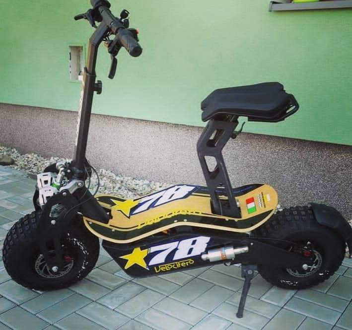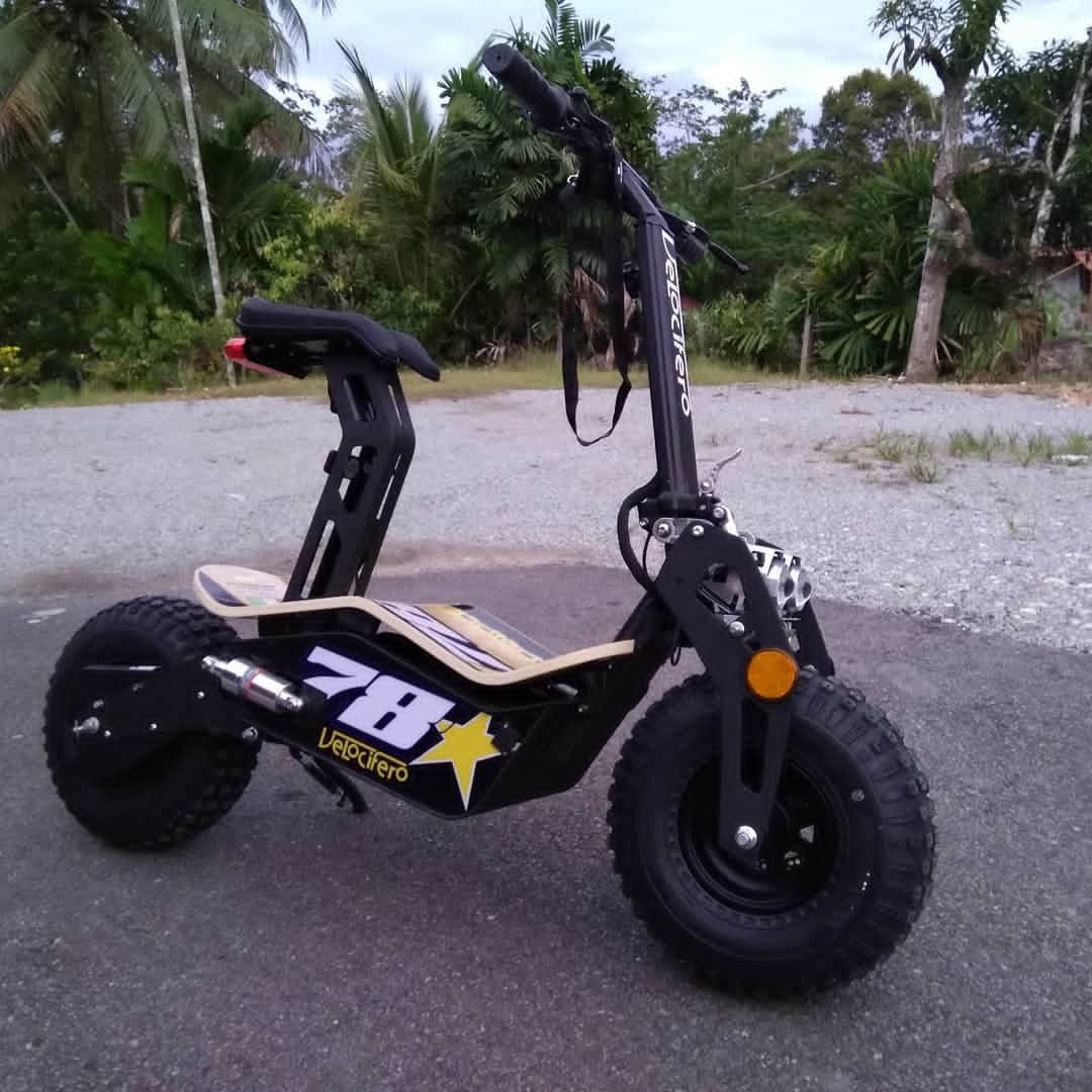 The Velocifero MAD 2000W is a robust, all-terrain electric scooter featuring a powerful 2,000 W brushless motor and 60 V lithium-ion battery pack designed for urban and off-road use. It delivers a top speed of approximately 50 km/h and a range of up to 40-50 km per charge under typical conditions. The scooter’s chassis is constructed from high-tensile steel and mounted on fat 145/70-6 tubeless tires paired with front earless suspension and dual rear shock absorbers for superior comfort and traction. Dual hydraulic disc brakes front and rear ensure confident stopping power even under load or uneven terrain. The deck includes a bamboo footboard hinting at its unique styling, and the seat is adjustable and removable for flexible use. The handlebar height is adjustable between 95–109.6 cm and the seat height between 75–80 cm, allowing for ergonomic customization. With a payload capacity of up to 140 kg and a total weight around 48 kg, the MAD 2000W blends high-spec performance with practical portability. Designed for the adventurous rider, this scooter combines bold styling, strong performance, and adaptable comfort for both daily commutes and rugged exploratory journeys.